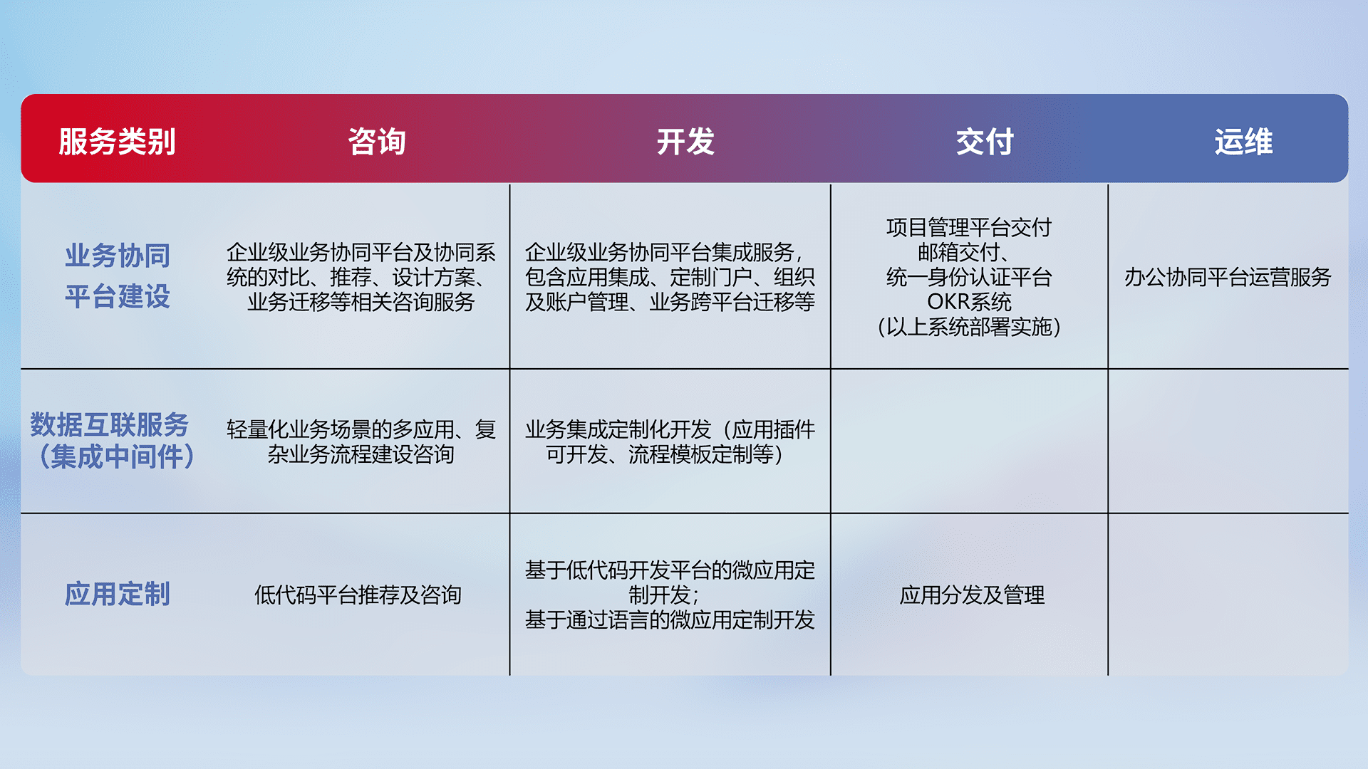 针对钉钉、、、企微、、、、IDaas等平台级产品提供产品的规划、、、、方案、、交付、、、、定制化开发等服务,,,实现如统一协同办公、、、智能客户服务、、混合会议管理、、、、智能数据查询、、、、等业务场景,,实现数字化转型。。。